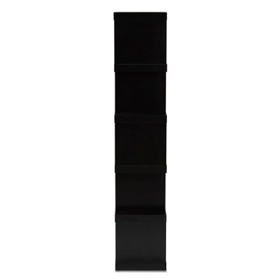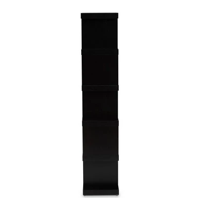 Add visual interest to your living room or office with the Dora bookshelf. This wooden bookshelf showcases a sleek dark brown finish that is easy to coordinate with any color palette. Four staggered tiers create a visually striking display for all your favorite books and knick-knacks. Its narrow profile makes it well suited for smaller spaces. The Dora bookshelf is made in Malaysia and requires assembly. Dimensions: 57.01″ high x 35.04″ wide x 11.34″ deep; Small shelf: 11.67″ high x 22.67″ wide x 10.82″ deep; Large shelf: 9.37″ high x 20.9″ wide x 11.33″ deep;