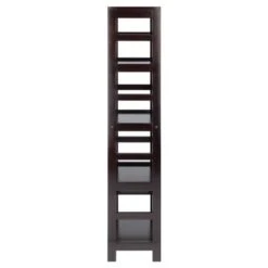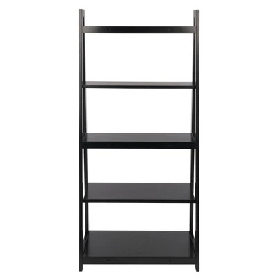 Enhance your room decor with an urban, industrial appeal with the Adam A-Frame Shelf from Winsome. with five tiers supported on a ladder-like silhouette, this decorative frame shelf brings a fresh look to your interiors, while the black finish lends a sophisticated touch to any setting. Perfect for displaying your prized book collection, this five-tier shelf provides ample space for filling it with framed photographs, decorative pieces or figurines. There are 5 total shelves of differing sizes. Overall shelf size is 27.8″W x 12.9″D x 58″H. Combine this with the Adam Desk and Corner Shelf to create a complete look. All five shelves are 26.3″W. 1st Top Shelf depth is 4.1″D, 2nd Top 6.”D, Middle 7.9″D, 4th Shelf 9.75″D and 5th Bottom Shelf 11.6″. There is a 12″ Clearance between each shelf. Made with combination of solid and composite wood in black finish. Assembly required.