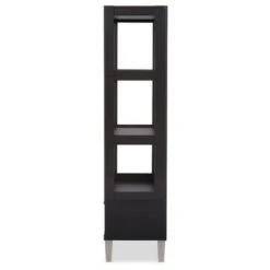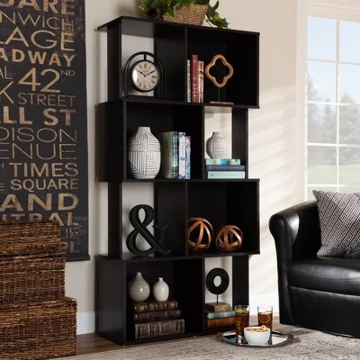 Display your book collection on the visually striking Riva bookshelf. Constructed from wood, the Riva displays an elegant dark brown finish that complements any color palette. This modern, abstract piece features four enclosed shelves aligned in a zig-zag pattern, providing a unique space to display your favorite books. Four open shelves provide additional display space. The Riva bookshelf is made in Malaysia and requires assembly.