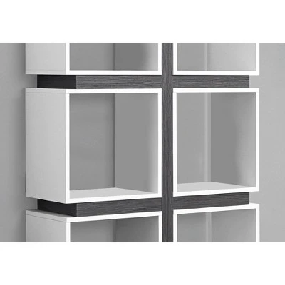 Give your home a modern art-deco look with this 8 cubic shelf bookcase. This perfectly symmetrical bookcase has 8 cubic spaces to showcase all your collectibles. With an open back, this piece can also be used as a room divider. Featuring a gray cedar finish and white thick paneled shelves, this unit will be the focal point of any room.