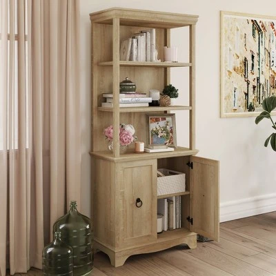When completely open shelving isn’t your style, and a bookcase with doors feels clunky, this double-duty 5 shelf bookcase with open and hideaway storage from the Adaline Café™ collection gives you the best of both worlds. This bookcase with doors features three shelves for open storage and display of items like books, home décor, photos of your family, and more. Hidden storage behind the two chic doors features an adjustable shelf so you can customize this display bookcase to fit your specific hideaway storage needs. This wood bookcase with doors is versatile enough to fit seamlessly in any room of your home: whether you need bookcase storage in your home office, open shelving in your living room, or display space in your entryway or bedroom. Finished in a universal Orchard Oak™ and detailed with stylish hardware, this living room bookcase is the perfect addition to your home.