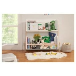- Top shelf designed for displaying favorite books with lower storage cubbie for storing books, dolls, and toys