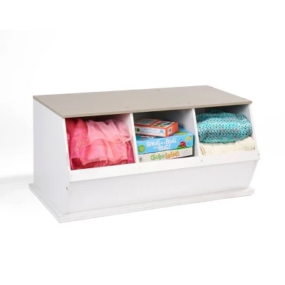 Badger Basket’s Three Bin Stackable Storage Cubby/Bin is a sturdy, modular storage solution for keeping all sorts of items tidy in any room. Features three, large, open compartments and it can be stacked with other bins to expand your storage capacity (each unit sold separately). Use for storing books, papers, media, dolls, toys, sporting goods, games, craft supplies, linens, and more! Wide mouth openings make it easy to load and unload. When you need to clean up quickly, it is a breeze to stuff everything inside! Great for kids when learning to sort and organize. Top surface offers an additional place to keep collections and trophies. Easy to clean, solid panel, smooth surface construction. Made of engineered wood with melamine lamination. Badger Basket’s Three-Bin units can mix and match with Badger’s Two-Bin and Shelf Storage units. Overall unit measures approximately 37.25 inches L x 19.25 inches W x 17.25 inches H. Each bin measures 11 inches L x 17.25 inches W x 15.75 inches H. Height from floor to top edge of front panel is 9.25 inches. Assembled weight: 33.5 pounds. All measurements approximate. Wipe clean and dry thoroughly. Adult assembly required. When stacking multiple bins, you must always use the included safety brackets to secure the units together. If stacking three or more bins high, we recommend using wall anchor/furniture safety straps (not included) to anchor the units to the wall for safety. Wall anchor straps are not included due to the many types of walls found in homes. Please consult with your local hardware retailer. Product may vary slightly from shown. Props/accessories shown are for illustration purposes only. Product complies with all currently applicable safety standards. Actual color/finish may vary from screen display. This item ships in its original carton that may include a product photo. Soft plastic/rubber toys (such as balls) can react with the finish when left in prolonged contact. Be mindful of what is stored in the unit.