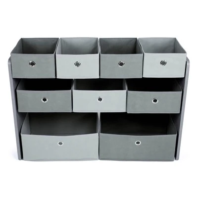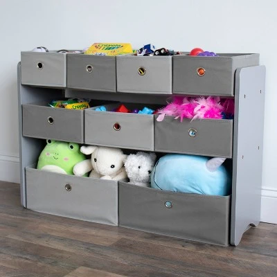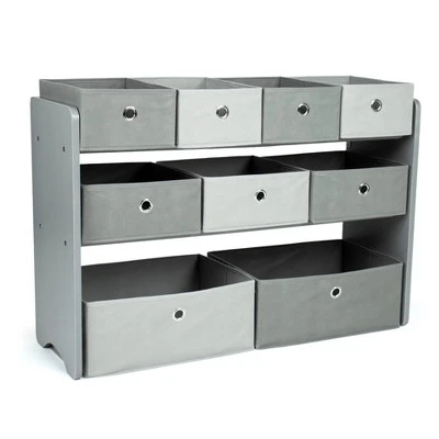 Playtime becomes more fun when your kids can easily take out their toys, books and games and then quickly clean up afterwards. The space-saving Humble Crew Toy Storage Organizer with 9 Storage Bins stows your children’s toys in easy-to-see, easy-to-access collapsible fabric storage bins. Two (2) large, three (3) medium and four (4) small storage containers are easy to remove, replace and reposition along the 3 tiered organizer shelves. Storage bins are sized just right within the toy organizer for toddlers and preschool aged children. Sturdy engineered wood construction frame with steel shelving rods, 20 pound weight capacity per level. Some assembly is required. A great toy storage box alternative; helping keep your little one’s room clean and organized while at the same time teaching sorting and cognitive skills. Perfect organizational solution for bedrooms, nurseries, nurseries, playrooms and bathrooms.