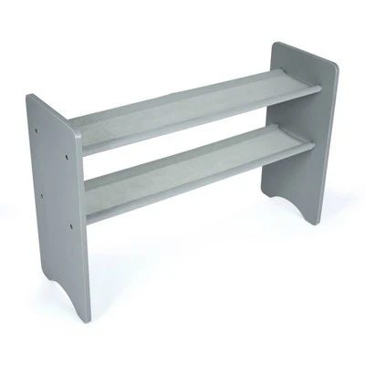 - Gray wooden finish with a blend of dark gray and light gray colored toy bins