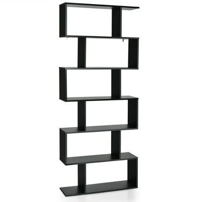 This 6-tier S-shaped bookcase is an eye-catching piece of modern furniture that can be coordinated with your other home decorations. With its sleek geometric shape and practical functions, this bookcase is widely applicable to various occasions, such as the lounge, living room, bedroom, office, etc. It provides 6 spacious open compartments, which not only can be used to display your souvenirs, trophies and collections, but can be used to store books, novels, and magazines. Each compartment has a large bearing capacity due to the sturdy wooden construction and wall-mounted anti-tilting device. The bookcase is not likely to wobble or collapse so that it is safer to use. Specification: Color: Black / White. Material: Engineering Board. Overall Dimension: 31.5” x 9” x 75” (L x W x H). Net Weight: 52.5 lbs. Shelf Height: 12”. Weight Capacity: 44 lbs. Package Includes:. 1 x Bookshelf. 1 x User’s Manual.