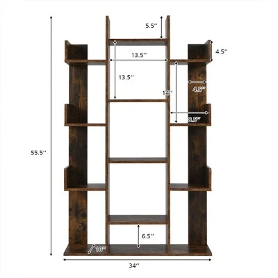 If you are looking for a bookcase, look no further! Our bookcase combines industrial style with a creative tree shape, forming a beautiful bookcase with surprise. Functionally, it has 13 shelves to organize your CDs, albums, books, plants, and more, as well as divide your room. And it is also a great addition and decoration itself in your living room, office, and study. Thanks to the premium wood material, this bookshelf turns out to be stable and durable. And with an anti-toppling device and anti-skid foot rings, this bookcase is good at keeping balance and all. Specification: Color: Rustic Brown. Material: Engineered Wood. Product Dimension: 34” x 10” x 55.5” (L x W x H). Weight Capacity of Each Lattice: 11 lbs. Net Weight: 47 lbs. Package Includes:. 1 x Wooden Bookshelf. 1 x Instruction Manual.