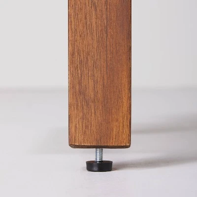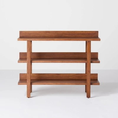 Organize and decorate your home in style with this Lipped Three-Shelf Wood Console from Hearth & Handâ„¢ with Magnolia. Made with wood in a brown finish, this rectangular console table is designed with extended sides for a modern look that suits your aesthetics. It comes with three open shelves and a slightly raised back to help you display books, decorative items and more while providing easy access to them. Place this brown console table in your living room and hang wall art above the table for a decorative look in your space.