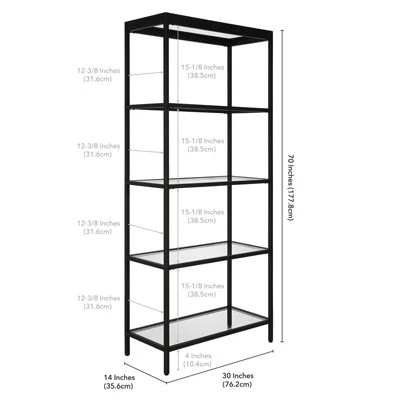 Clean, minimalist lines and sturdy tempered glass make this 70” bookcase the perfect storage space in any room. Proudly display your book collection, magazines and more on the 5 tiers of shelves. The streamlined look and neutral metallic finish pairs seamlessly with your existing color scheme and décor style.Features : Shelves are made of durable tempered glass.Tip-restraint kit included for safety.Middle shelves have a weight capacity of 40 lbs each. The bottom shelf can hold 50 lbs.Clean with a soft, dry cloth; no harsh chemicals or abrasive cleaning materials.Features easy assembly.Specifications : Product Dimensions : 14″ x 30″ x 70″Product Weight : 60.85 lbs
