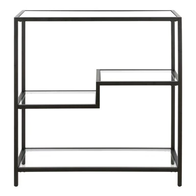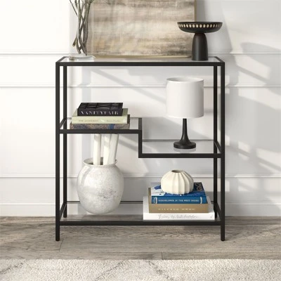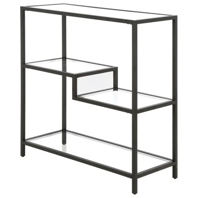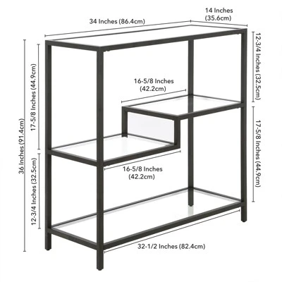 Designed to blend perfectly with your existing modern décor, this sturdy bookcase stands at 36″ tall. Its compact footprint makes this the perfect storage space if you’re working with a tight corner or smaller home office space. The geometric, staggered shelving is made of durable tempered glass, creating plenty of storage without weighing down the room visually. The four tiers allow you optimal space to display your books, pictures frames, plants and more!Features : Compact size is perfect for small spacesTabletop and shelving are made of durable tempered glassHandcrafted finish is applied to the steel frameTop and bottom shelves have a weight capacity of 30 lbs; middle shelves can support 20 lbs.Features easy assembly.Clean with a soft, dry cloth; no harsh chemicals or abrasive cleaning materials.Specifications : Product Dimensions : 34W x 14D x 36HProduct Weight : 39.9 lbs