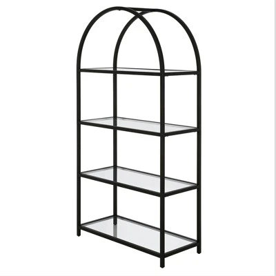 Showcase your favorite books and decorative items with this Art Deco-inspired 4-tiered bookcase. Clean architectural lines evoke a modern look, while the arched frame adds a pop of retro styling. Crafted of steel and sturdy tempered glass, its finished in a classic neutral metallic tone, allowing it to pair effortlessly with your existing den or home office décor.Features : Handcrafted finish applied to a steel frameCrafted of durable steel and tempered glass.Tip restraint hardware included.Features easy assembly.Clean with a soft, dry cloth; no harsh chemicals or abrasive cleaning materials.Specifications : Product Dimensions : 8H x 37.5W x 36.5DProduct Weight : 52.7 lbs