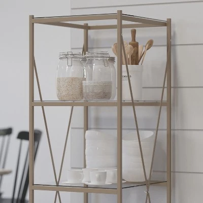 Welcome modern elegance into your home with this beautifully crafted 4-shelf bookcase designed to showcase your décor, photos, books and more. The durable crystal-clear glass shelves allow light to flow through while the elegant matte gold frame and cross bracing adds an air of modern-day sophistication. This versatile piece is sure to blend seamlessly into any style of home and does an incredible job in displaying your treasured memories. Additional Features: Clean with Water-Based Cleaner and a Dry Cloth, Assembles with Illustrated Step by Step Instructions, Item Size: 19.25″W x 15″D x 64″H