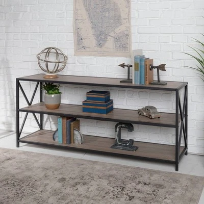 Modern Farmhouse X Frame Metal and Wood Media Bookshelf – Saracina Home Barnwood