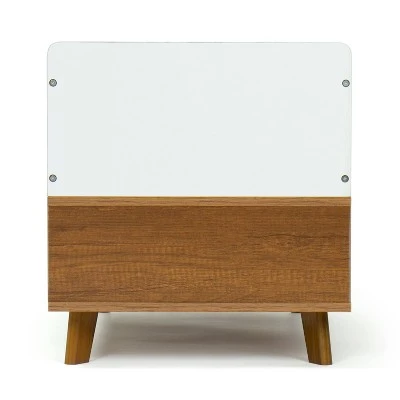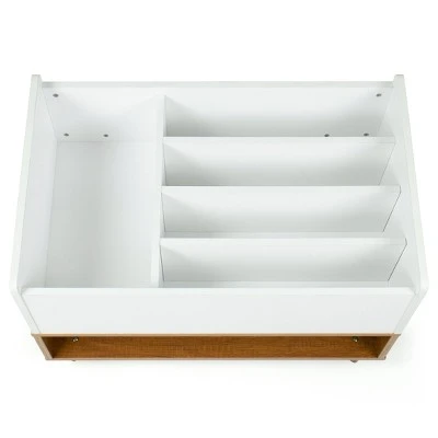 Cut back on clutter and achieve a tidy and organized space with Humble Crew’s stylish Bookshelf Caddy and Toy Storage with Shelf. Four deep upward-facing cubbies in white wonderfully compliment the rich chestnut wood open shelf below to store your books, magazines, and décor. This versatile style is ideal for the bedroom, kids playroom, or living room. At only 17 inches high, this piece is the perfect small-space storage solution and keeps storage in reach for your little ones. Cleaning and maintaining this durable sturdy wood construction is a breeze so your space is always neat and tidy. Fun mid-century legs complete the fresh, Scandinavian look of this piece, making this the perfect organizational piece for any room in your cozy, modern home.