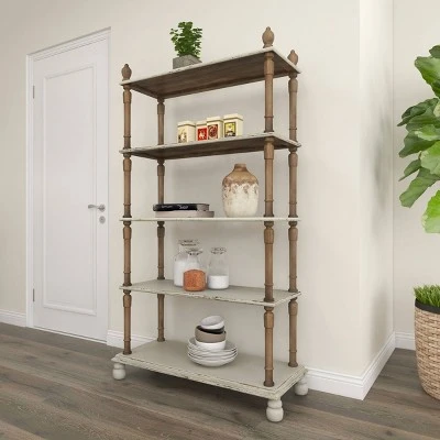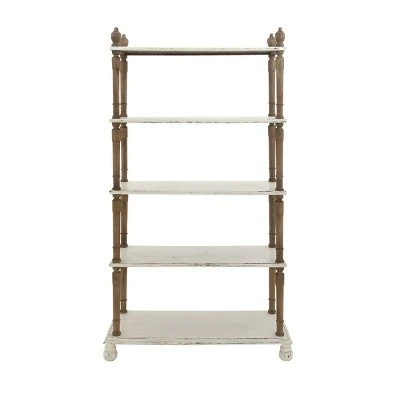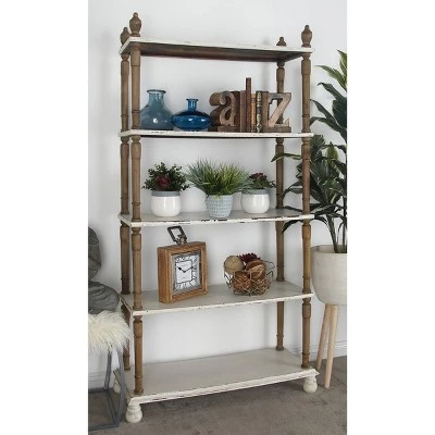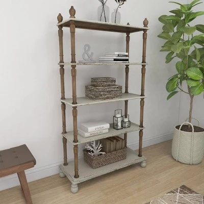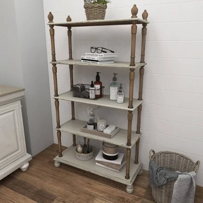 - This farmhouse style inspired white wood shelf features solid wood frames with a total of 5 shelves including the top and bottom