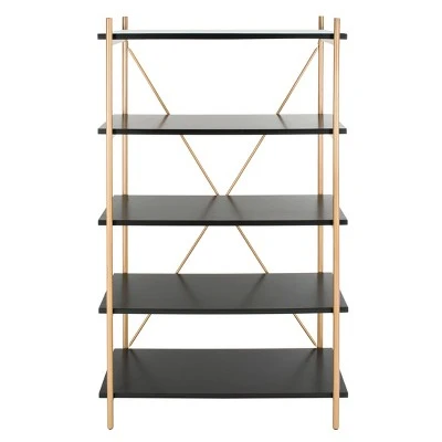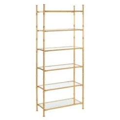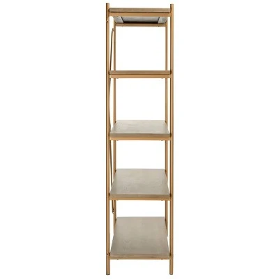 Filled with character and charm, this modern 5-tier étagère was designed to exhibit any curated collection of fine objects. Crafted with a warm rustic oak finish, its gold metal frame adds a luxuriant touch to any living room, dining room or home office. The minimalistic style of Rigby helps adds to your books, pieces, and whatever knick knacks placed on the shelves. A lovely add with sweet country touches to a modern or transitional room.