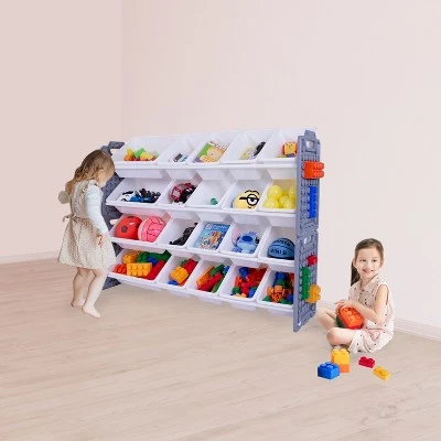 UNiPLAY Toy Storage Organizer with 20 removable plastic bins for easy-to-see and easy-to-access your toys and books when finished. It is made of a sturdy plastic panels, metal support rods and durable, easy to clean plastic bins. The storage solution for organizing your home, classroom and/or office space. This 20-bin organizer is suitable for organizing nursery items, clothes, toys, arts and crafts, books, office supplies, toiletries, garage storage, pet supplies, and more. Can be used indoors, such as bedroom, playroom, garage, classroom, and/or office. Available in 4 colors to fit your style: white, gray, primary and pink